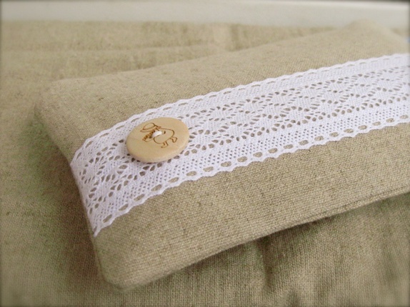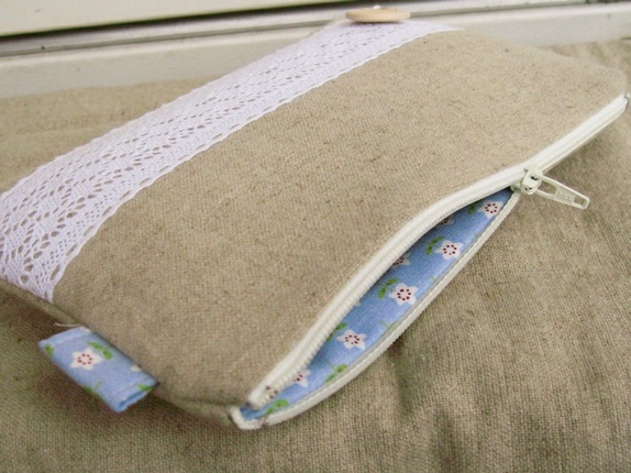 - En middels stor pung laget i linblanding med blonder og en fin knapp i tre. Lekkert for i lyseblått med små blomster og med strykeinnlegg for stabilitet og styrke.