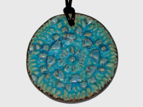 Dette smykker er laget i keramikk.Glasert med fargen turkis.Smykket henger i en lærreim med lås.Du kan selv velg lengde på reimen bare send en mail til om dette.