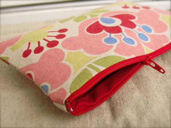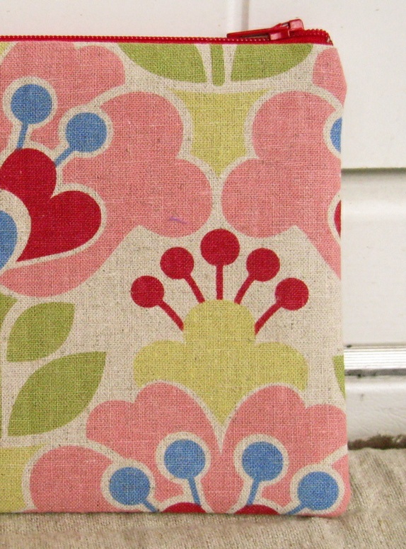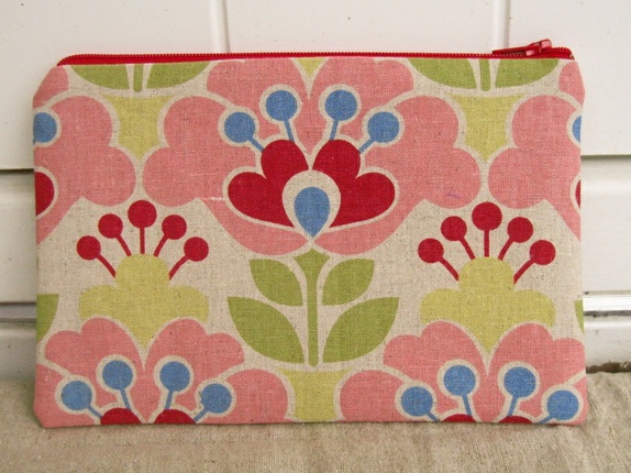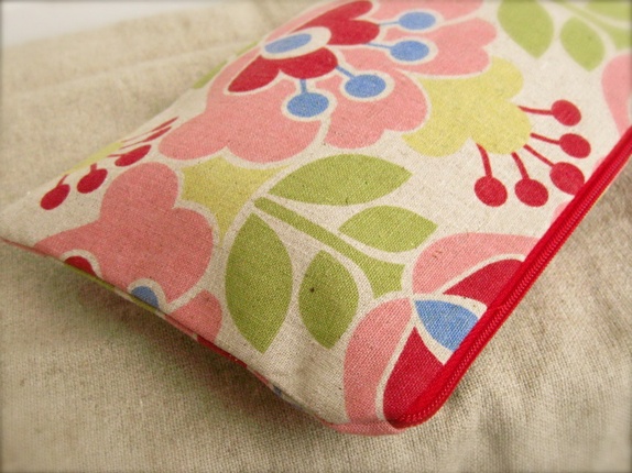 - En middels stor pung laget i japansk bomull/lin i rødt, blått og grønt. Foret med rød bomull og med strykeinnlegg for stabilitet og styrke.