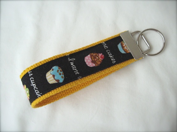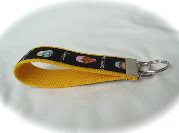 Personlig nøkkelring i stoff (muffins) sydd på kraftig bomullsbånd. Solid kvalitet.