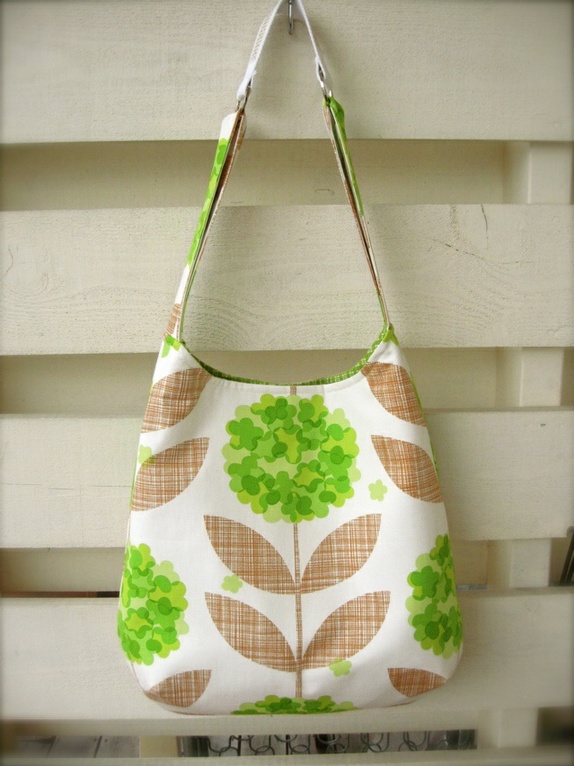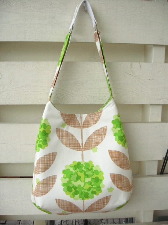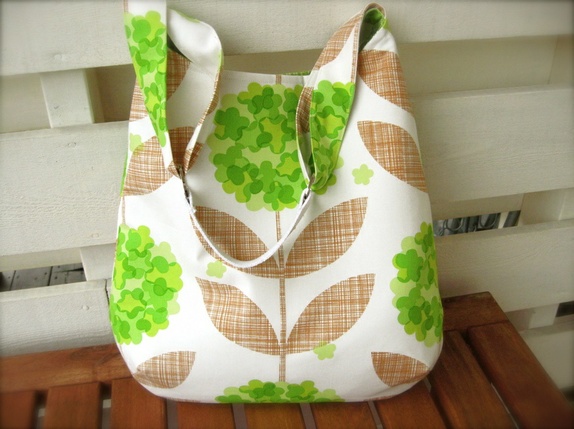 Stor skulderveske i originalt stoff - grønne blomster på lys bunn. Unik og personlig.