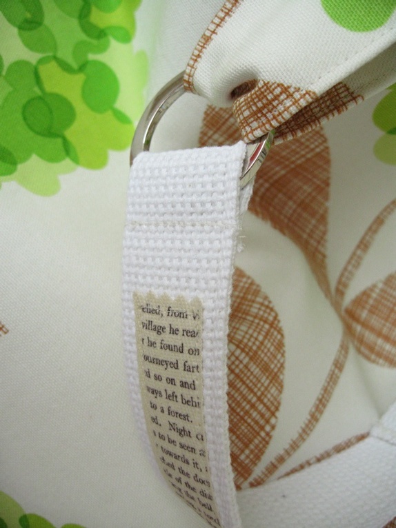 Lang skulderrem med stilige ringer i blankpusset stål. Midtstykket er et kraftig bommulsbånd hvor jeg har sydd på et stykke pyntebånd med liten bokskrift.