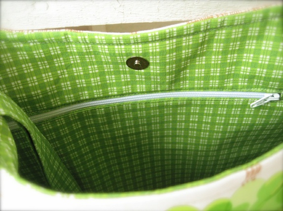 Innvendig foret med bomull i grønne og hvite ruter. Nøkkelkrok i bånd og stor lomme med glidelås.
