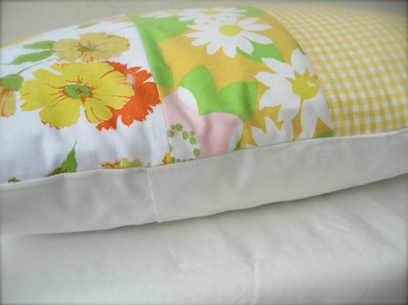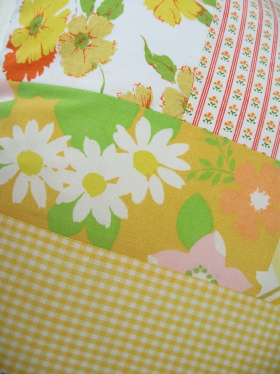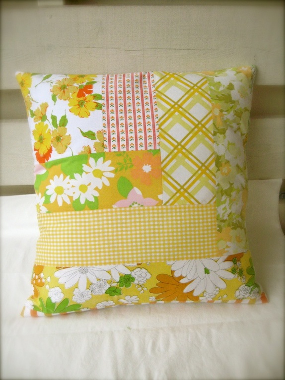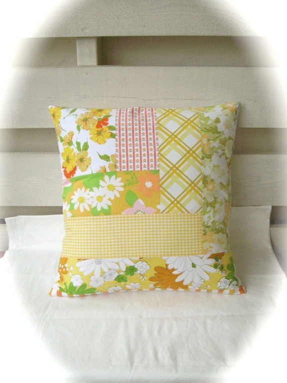 Stort putetrekk sydd av gjenbruk stoffer i gule nyanser.