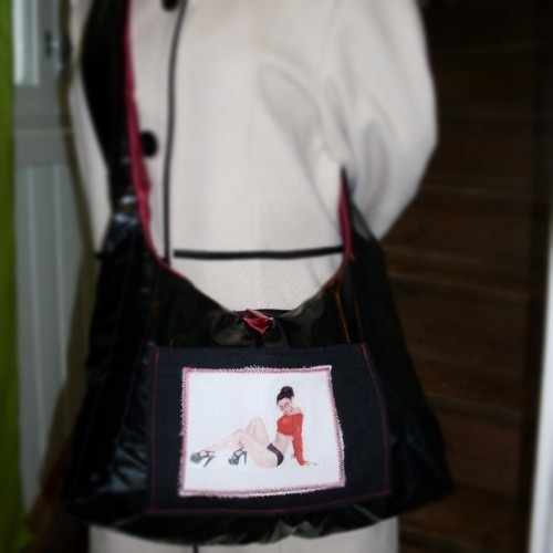 Sexy veske sydd av en dameregnkåpe i myk, sort lakk. Vesken er fôret med burgunderrødt glatt fôrstoff og den har en lomme på innsiden og en lomme på utsiden med en "hot-babe" påtrykt. Knappelukking.