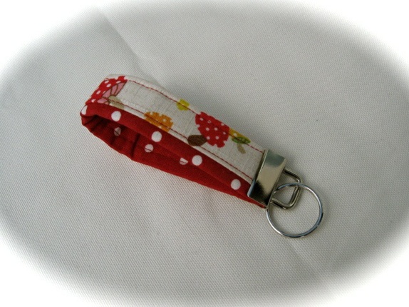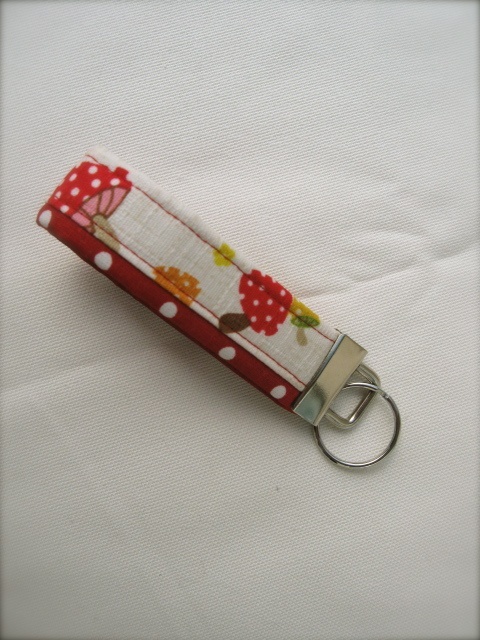 Personlig nøkkelring i 2 ulike stoffer - rød med hvite prikker og sopper på lys bunn. Med strykeinnlegg, så den er holder formen.