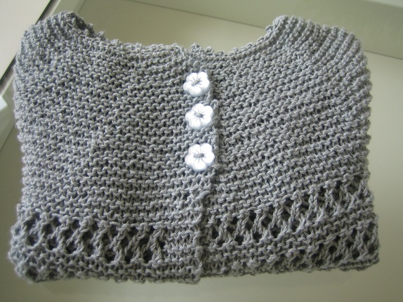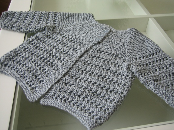 En lett og luftig jakke til baby, str. 3-6 mnd. Garnet er 38% lin, 31% bomull og 31% viskose, fargen er dus blågrå og passer like fint til jente som gutt.Maskinvask 30 grader.
