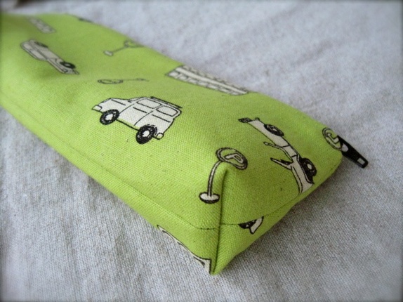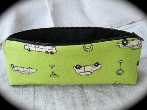 Skarp grønn bomull med biler og busser. Foret med svart solid bomull og med strykeinnlegg på begge lag.