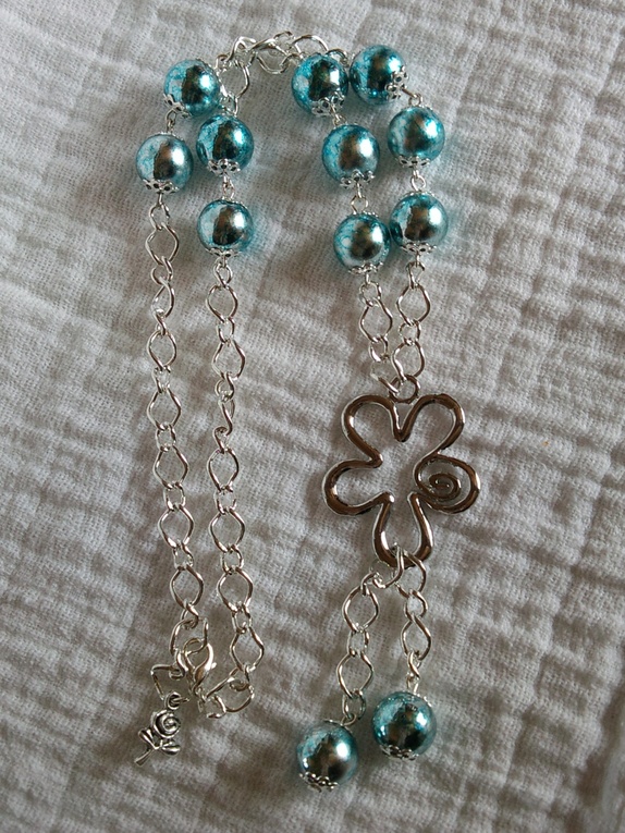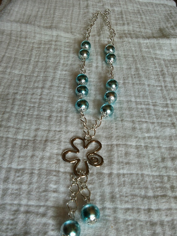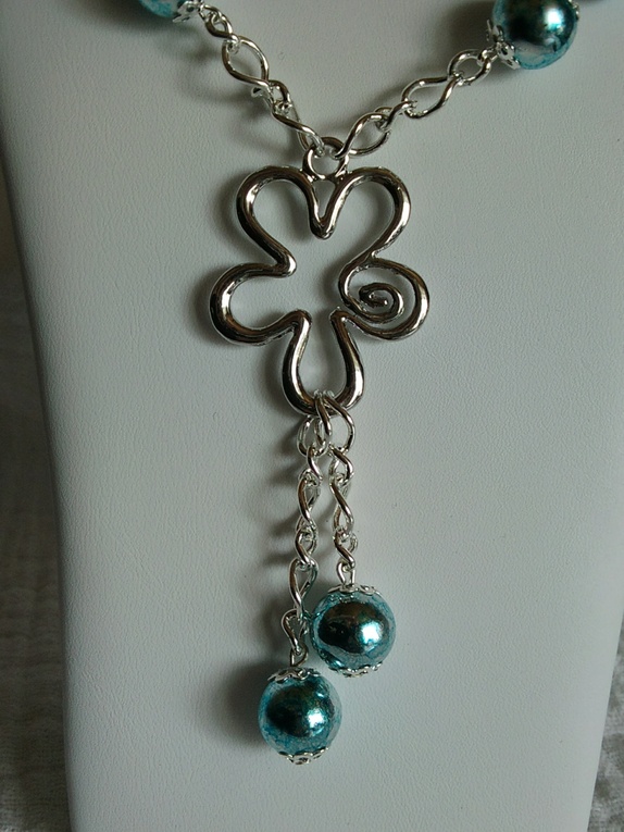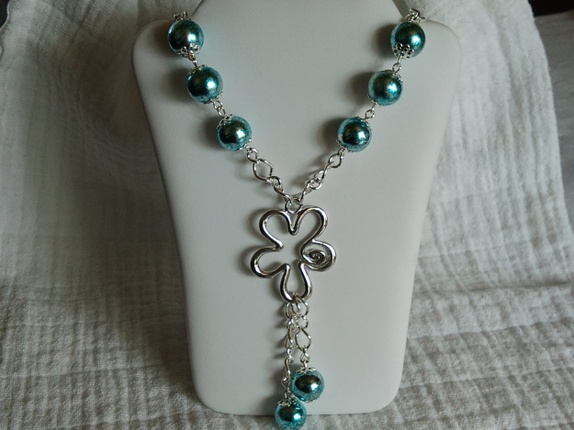 Halskjede laget av lenke og turkise flotte glassperler, metallblomst med anheng under.