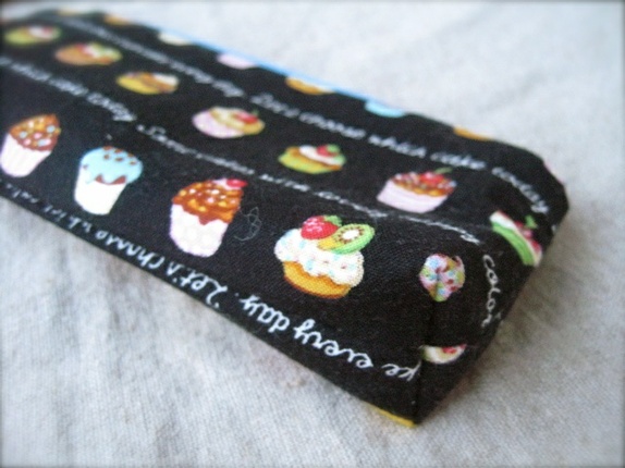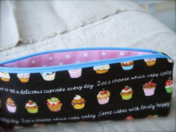 Japansk bomull med fristende muffins på sort bunn. Foret med bomull i rosa med hvite prikker og med strykeinnlegg på begge lag.