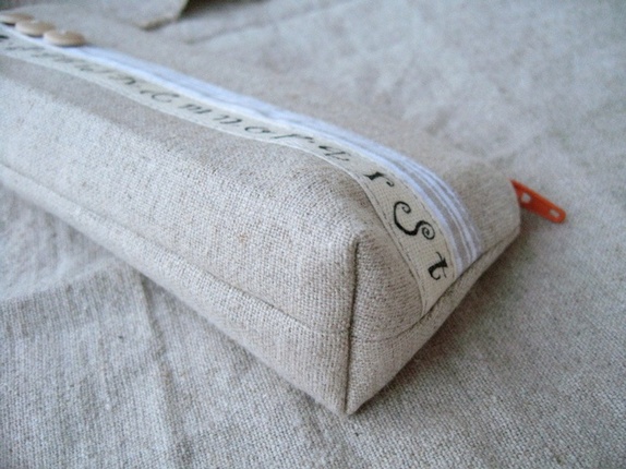 Lin og viskose med dekorative bånd og knapper i tre. Foret med lin/bomull og med strykeinnlegg på begge lag.