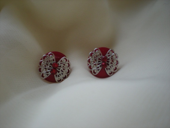 Søte røde øredobber med sølvfarget pynt og røde strass-stener.Finnes kun i dette ene paret.