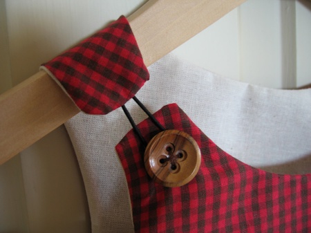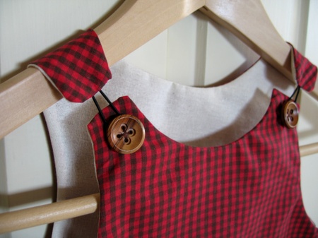 Denne kjolen er sydd av et trykt brun- og rødrutet stoff i 100% bomull. Knappene er av tre, og festes med strikkhempe. Fóret er ubleket bomullslerret i 100% bomull.