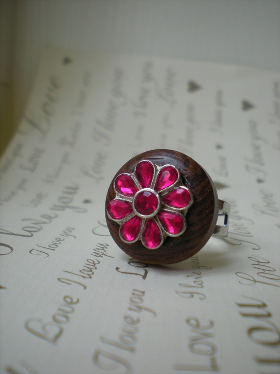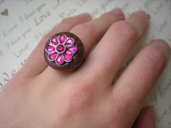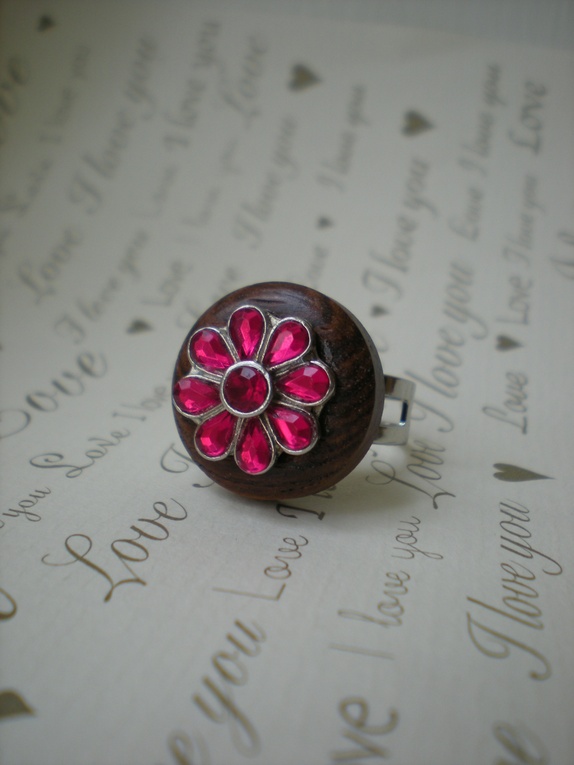 Ring i mørkebrunt tre og rosa glitrende strassblomst.