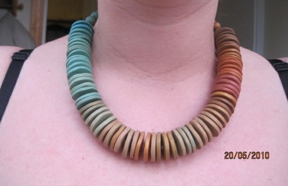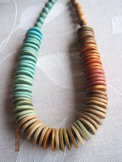 Tynne skiver av fimo tredd med en liten rocaileperle imellom. Lås ekte sølv belagt med 14 k gull