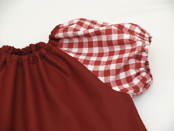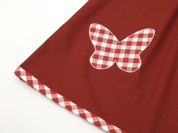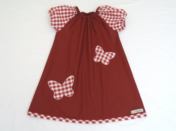 Rynkekjole med puffermer. Sydd av tipp-topp gjenbrukstekstiler i ren bomull. Stoffet i selve kjolen er ensfarget mørk rødt, mens ermene og kjolekanten nederst er rød- og hvitrutete. Kjolen er pyntet med to applikerte sommerfugler i samme stoff som ermene. Strikk i hals og ermer.