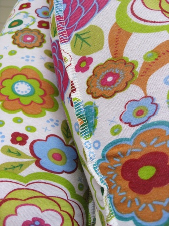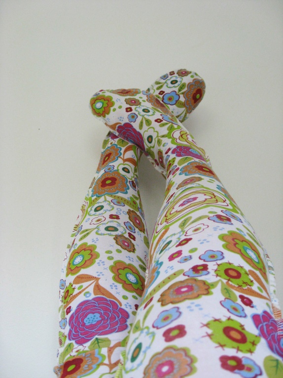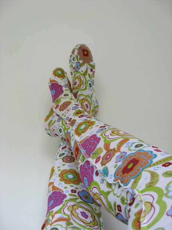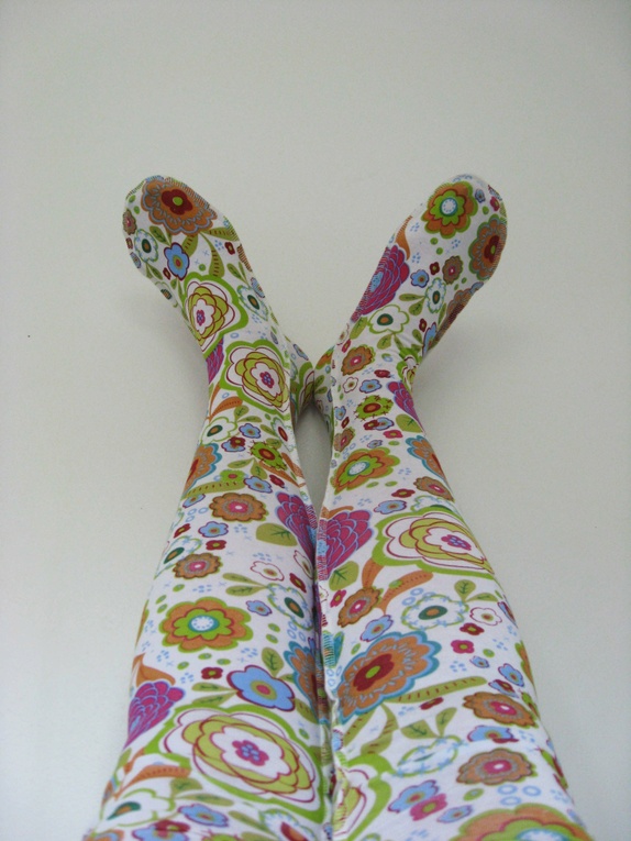 Lange, deilige knestrømper som rekker godt over knærne. De er sydd i en off-white jersey med blomstermønster i knallfarger. Knestrømpene er fasongsydd med en dekorativ overlocksøm på utsiden og i avslutningskanten oppe.