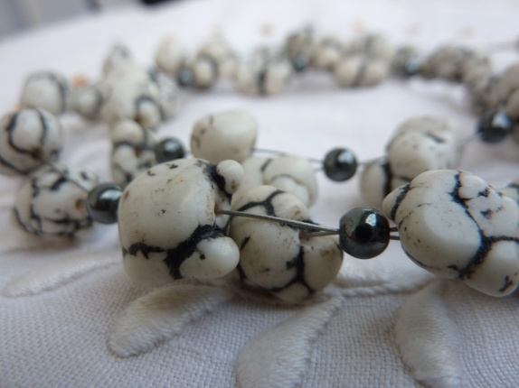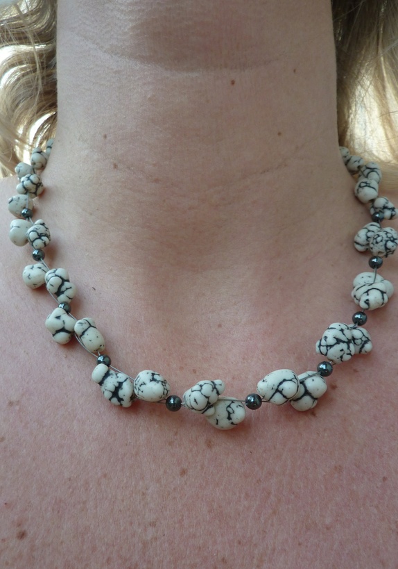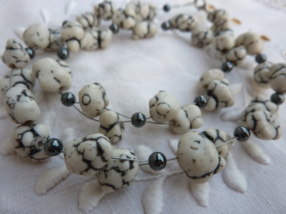 Smykke er meget spesielt med et artig utseende. Dette bør du bare ha....Har også ørepynt i samme serie.Naturmateriale i hvitt med nyanser i sort og grått.Hematitt (blodstein) imellom.Karabinlås. Smykke er 47,5 cm langt.