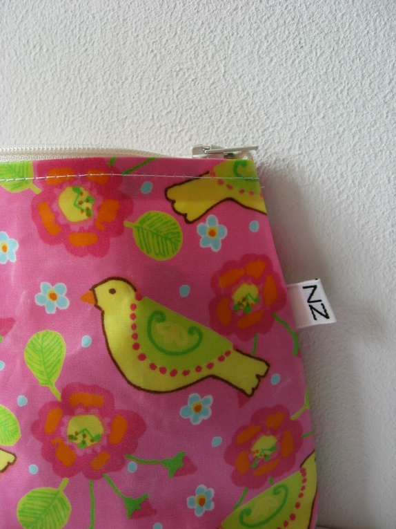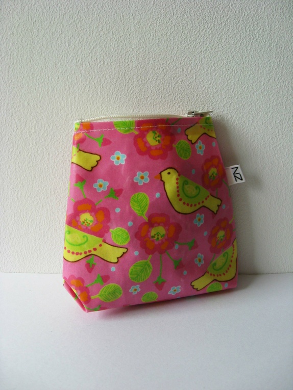Liten pung med 10 cm glidelåsåpning. Pungen er sydd i et friskt rosa og vannavtøtende materiale med gule fugler, grønne blader og blomster i lysblått og oransje.