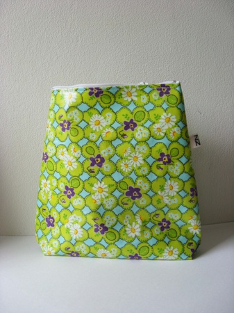 Mellomstor pung med 15 cm glidelåsåpning. Pungen er sydd i et fargerikt vannavstøtende materiale med grønne firkløverblader, blå fioler og et dryss av hvite prestekrager og et snev av turkis.