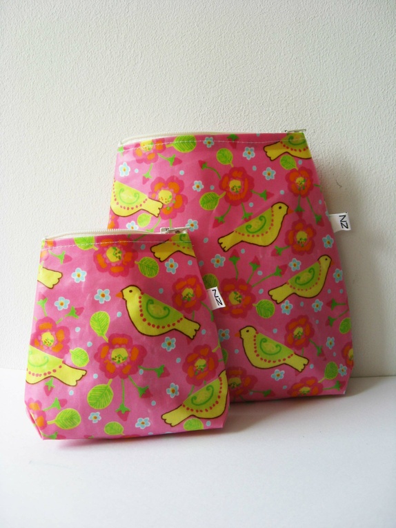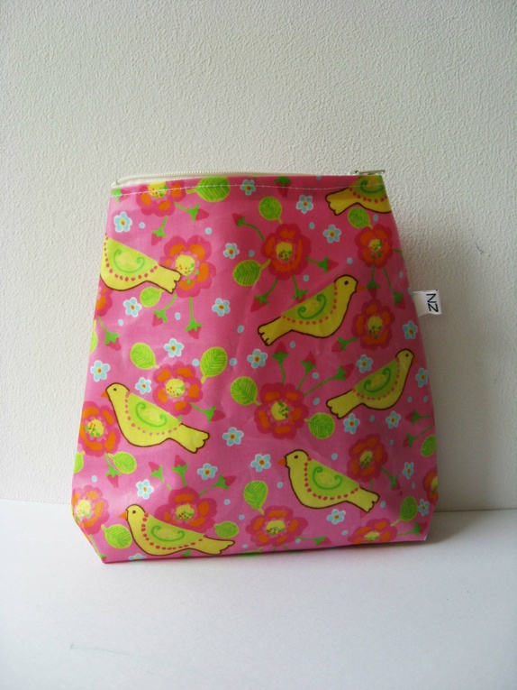 Mellomstor pung med 15 cm glidelåsåpning. Pungen er sydd i et friskt rosa og vannavstøtende materiale med gule fugler, grønne blader og blomster i lysblått og oransje.
