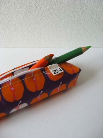 Pennalet er sydd i et lilla, vannavstøtende materiale med små og store, oransje epler. Og så et lite hvitt eple her og der.