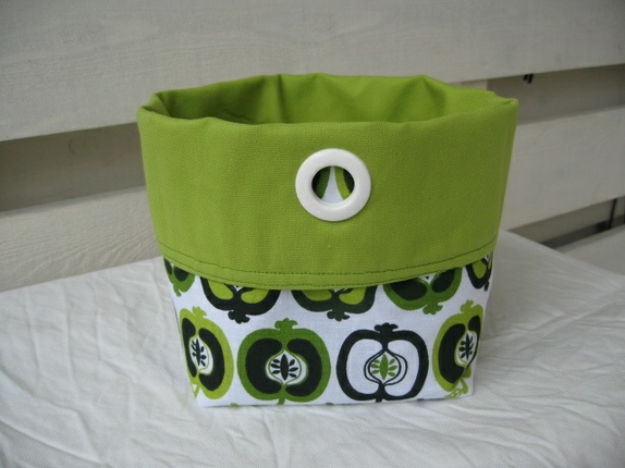 Romslig stoffkurv i bomull - grønne epler på hvit bunn.