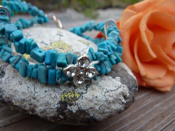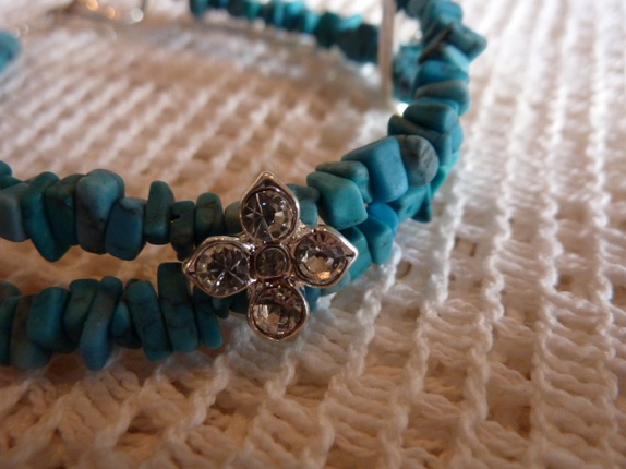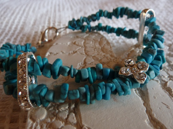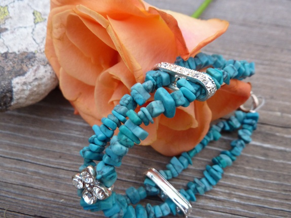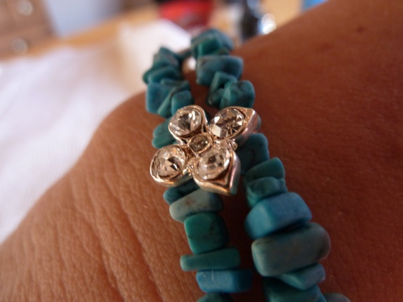 Armebåndet er laget av små steiner, turkis med pene mellomdeler.Karabinlås.20,5 cm langt.