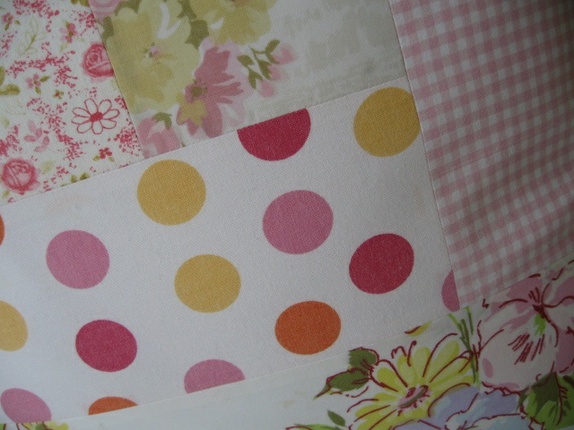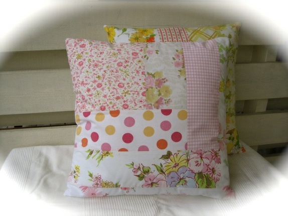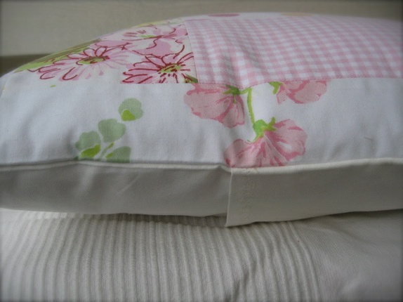 Stort putetrekk sydd av gjenbruk stoffer i rosa nyanser.