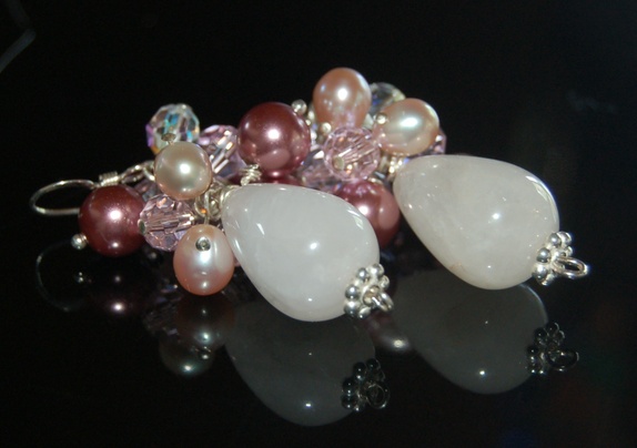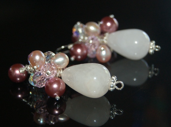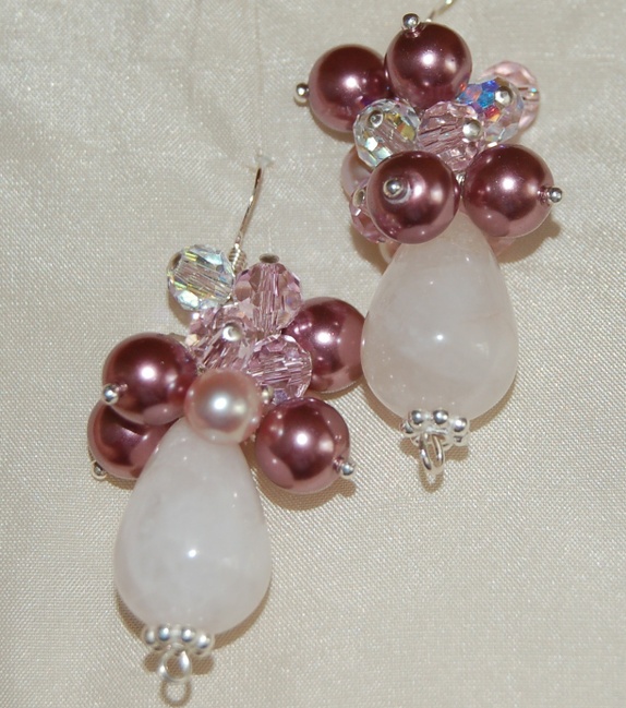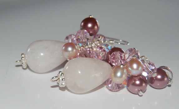 Rosa drøm. Dråper med sølv 925, rosenkvarts, swarovski, ferskvannsperler og glassperler.