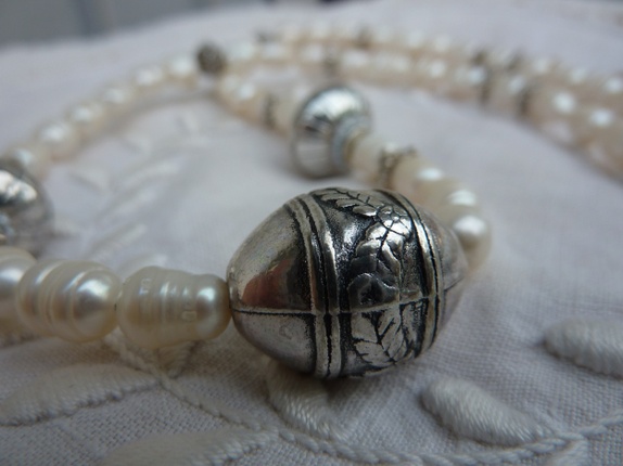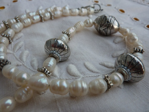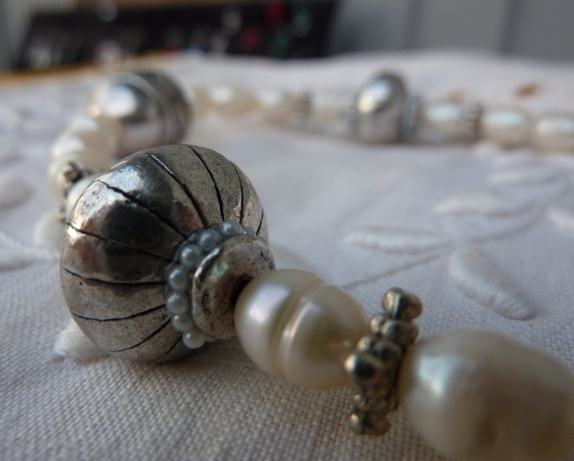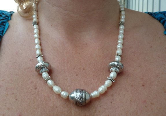 Halssmykke med ferskvannsperler og mellomdeler i metall.