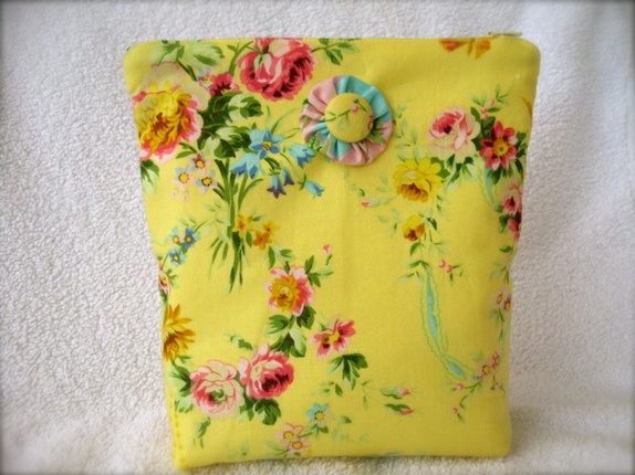 - En middels stor toalettmappe eller make-up bag laget i bomull. Foret med kremfarget bomull og med strykeinnlegg på begge lag for stabilitet og styrke.