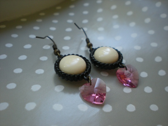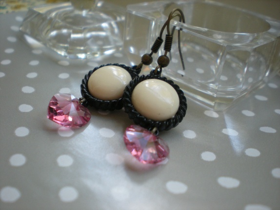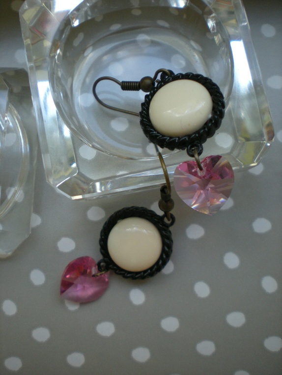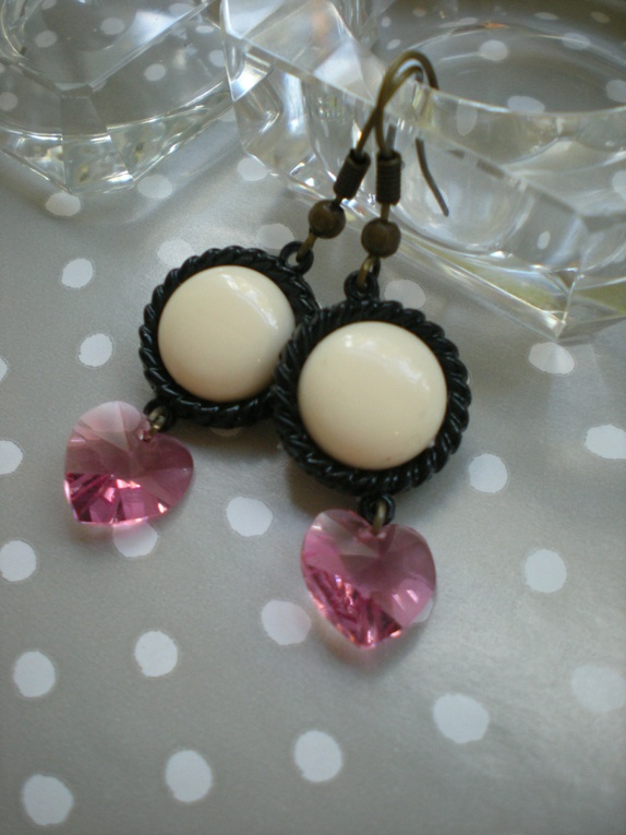 Søte, nette øredobber av sorte og kremhvite perler og rosa swarovski-hjerter.