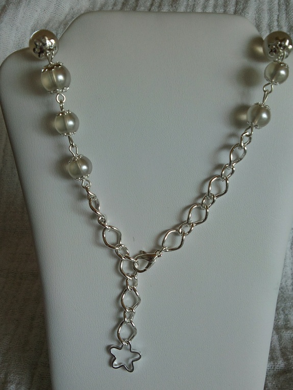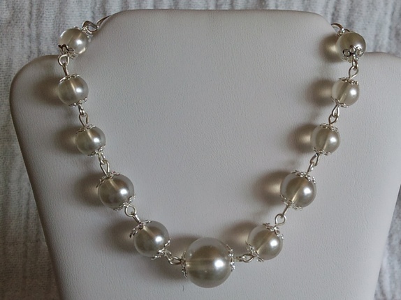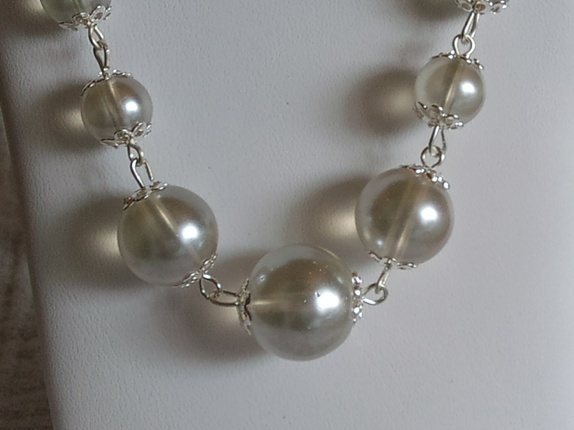 Halskjede laget av hvite glassperler i ulike størrelser. Lenke i forbindelse med låsen.