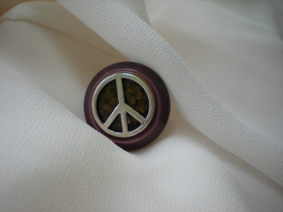 Ring i mørk lilla og brun, med peace-symbol som pynt.