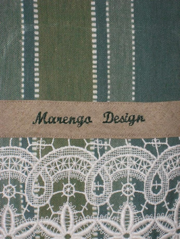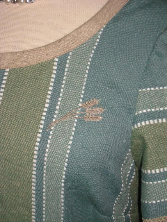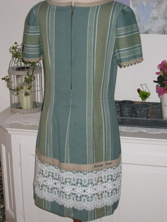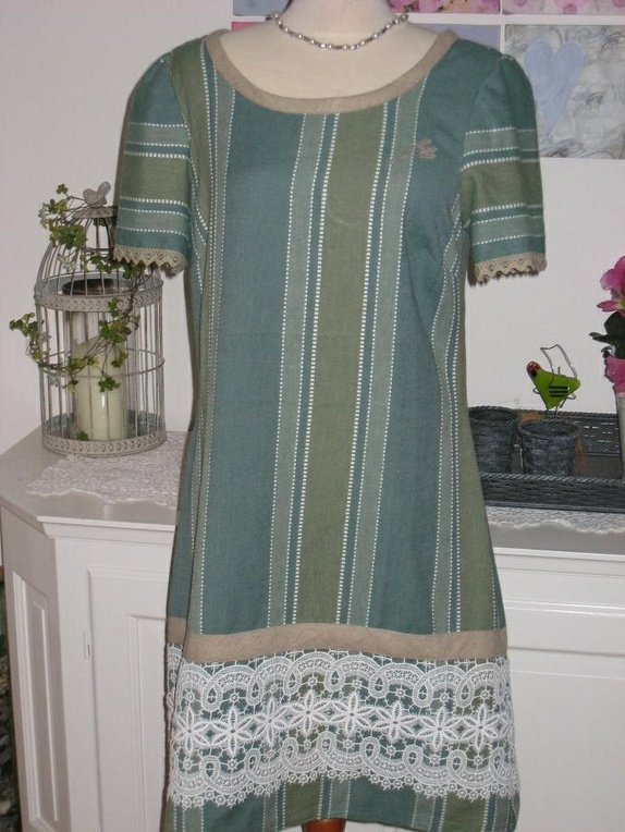 Kjole sydd i 100 % bomull i varierte grønnfarger.Den er pyntet med broderier, bånd og blonder.