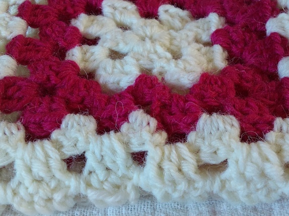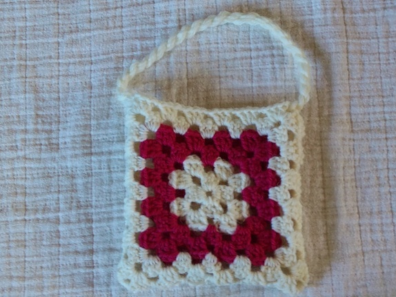 Vesken er heklet i 100% ullgarn, som en oldemorsrute, og er lik på begge sider.