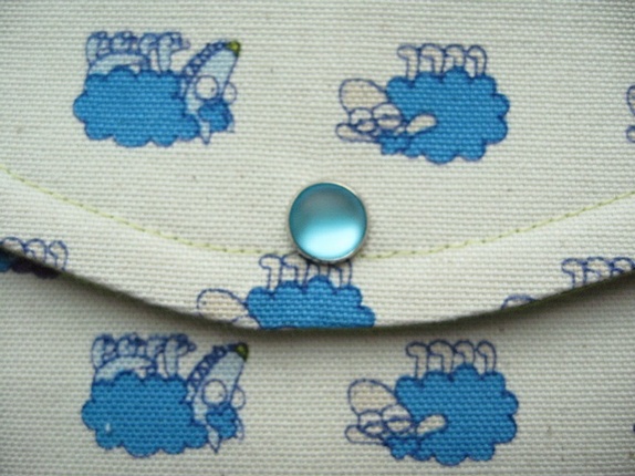 Lukkes med trykknapp pyntet med liten perle i blått.