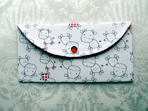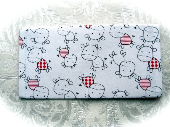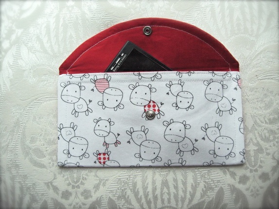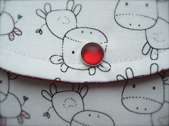 Det ytterste stoffet er små kuer hvor noen har fått rød genser. Foret med rød bomull.