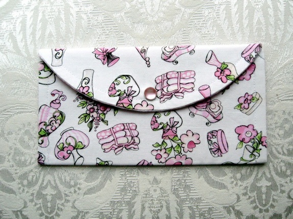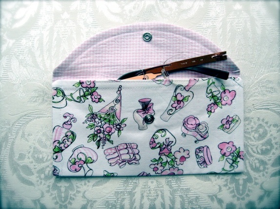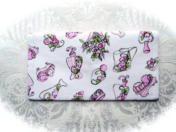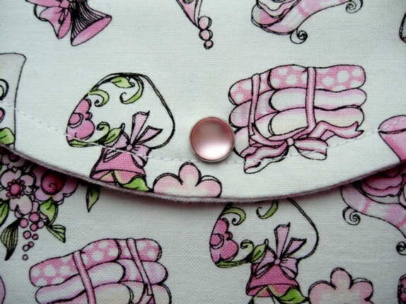 Det ytterste stoffet er hvit med små tegninger i rosa og lys grønt. Foret med bomull i rosa og hvite ruter.