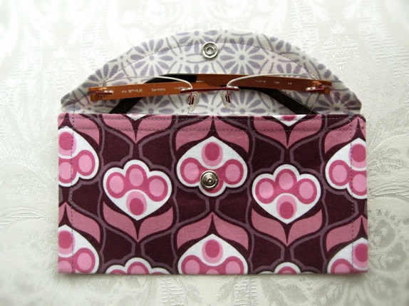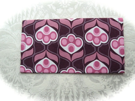 Det ytterste stoffet er lilla med rosa og hvite hjerter. Foret med bomull i krem og grålilla mønster.