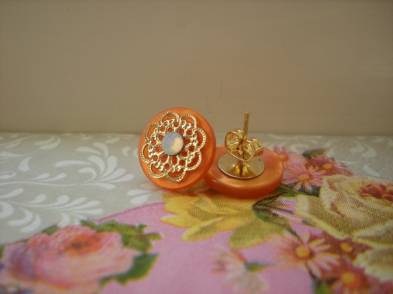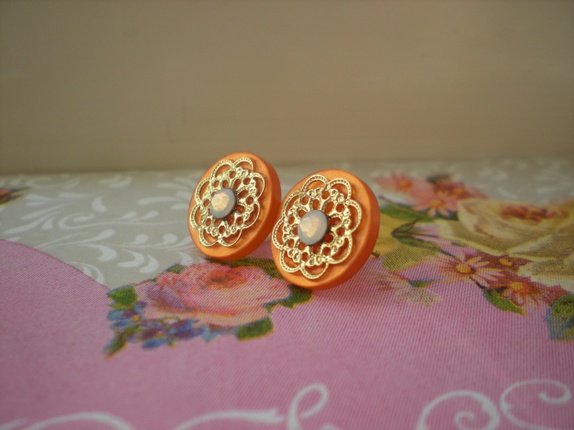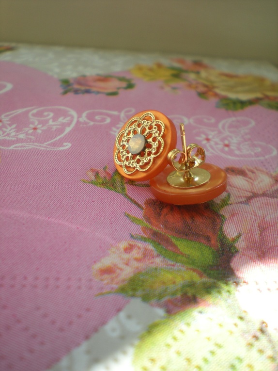 Orange øredobber med gullfarget pynt og hvite swarovski-stener.