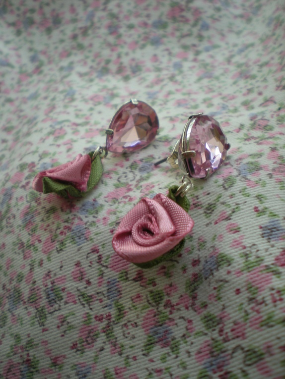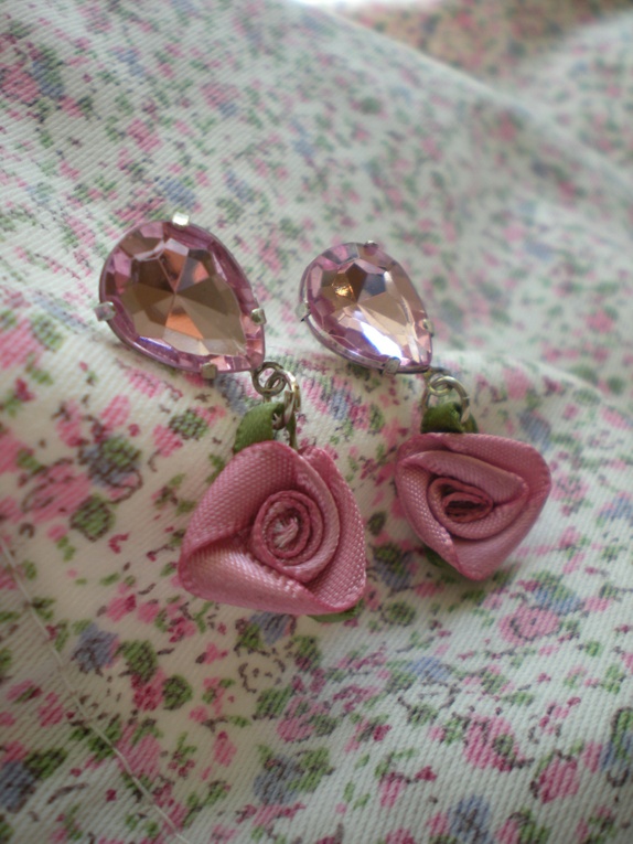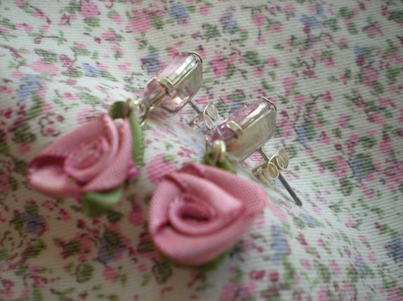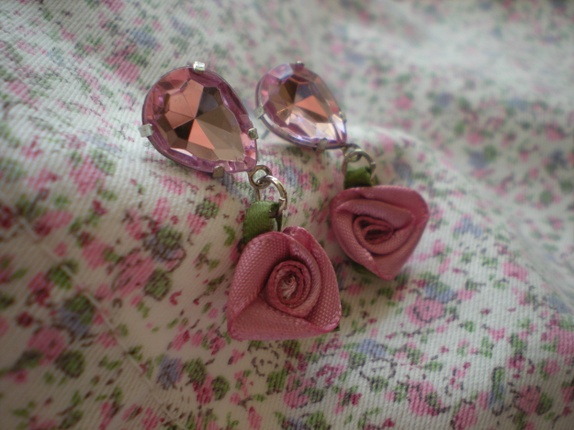 Nydelige øredobber med rosa glitrende plastperler og små, rosa sateng-roser.