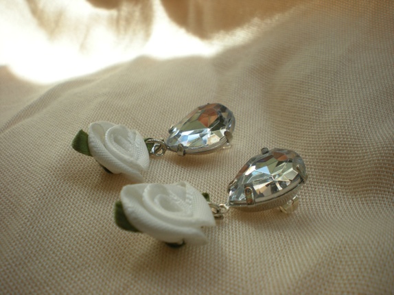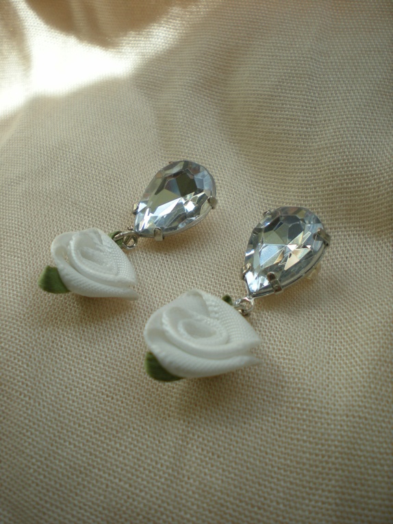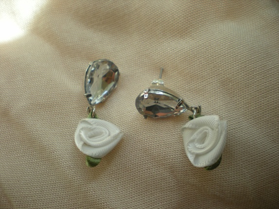 Søte øredobebr med glitrende, fasseterte plastperler og hvite, små sateng-roser.