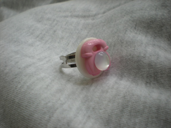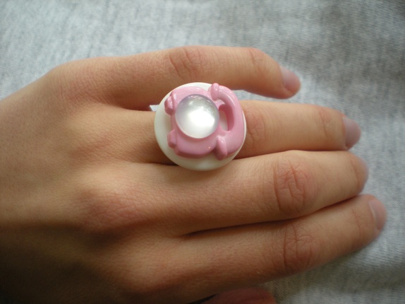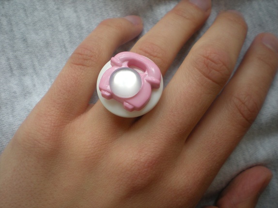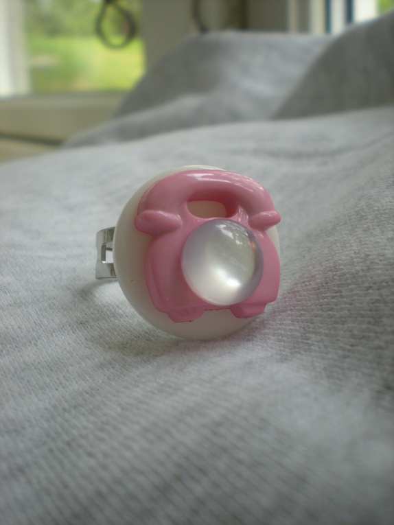 Morsom, søt ring med rosa telefon og blank, skinnende perle som dekor.