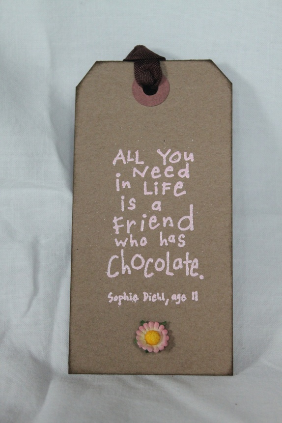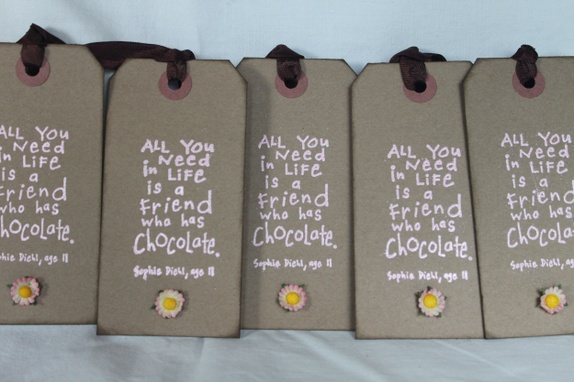Teksten på lappene er embosset (forhøyet) i sukkertøyrosa farge og lyder som følger: "All you need in life is a friend who has chocolate". På baksiden av lappene er det stemplet "To" og "From", og det er plass til en personlig hilsen.
