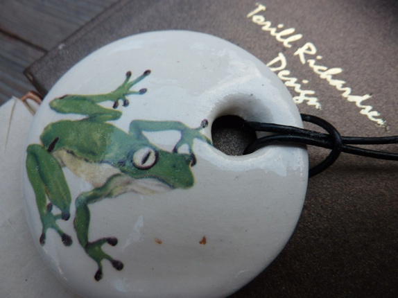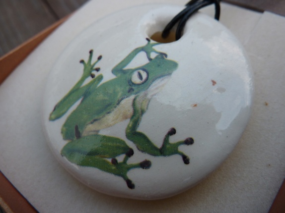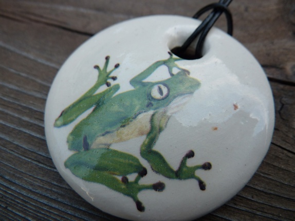 Halssmykke er laget av leirgods og er brent 3 ganger.Jeg har brukt dekal av en nydelig engel som dekor.Diameter 5 cm.Lærsmor med segulerbar knute.Smykke eske følger med.