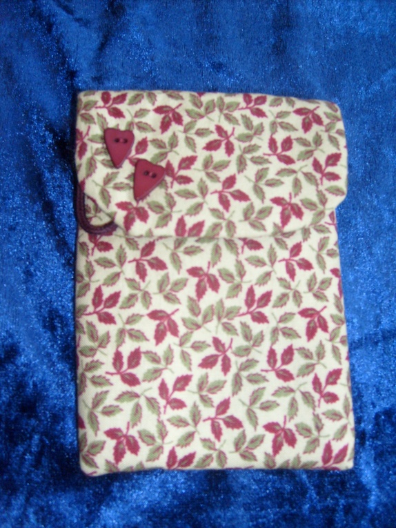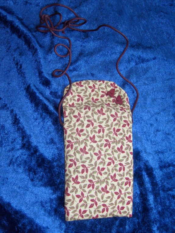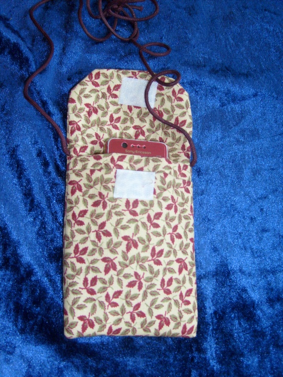 Liten veske/etui til mobiltelefon,ipod eller kamera. Str.9 x 12,5 cm.Vesken har to rom og lukkes med borrelås. Justerbar snor til å ha rundt halsen. Den er sydd i godebomullstoffer med vattering slik at mobilen er skjermet for støt.