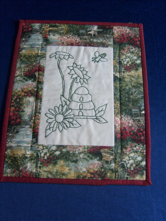 Brodert motiv med bikube, bie og blomst, grønt moulinegarn på lys beige bakgrunn.