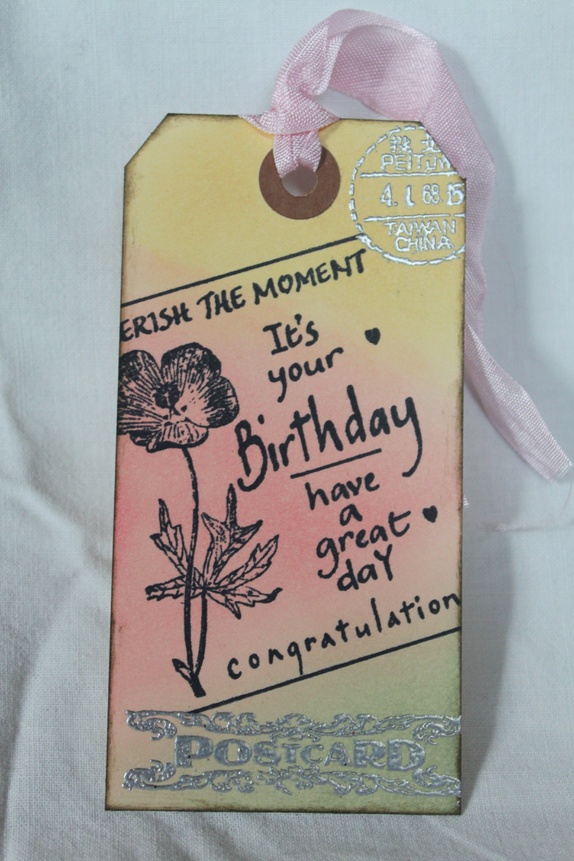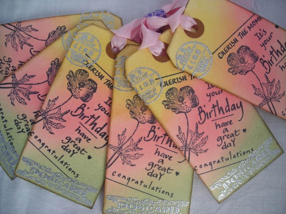 Lappene er farget i friske farger - grønt, rosa og gult. De er stemplet med et¨bursdagsstempel i sort og sølvembossede detaljer. På baksiden av lappene er det stemplet "To" og "From", og det er plass til en personlig hilsen.